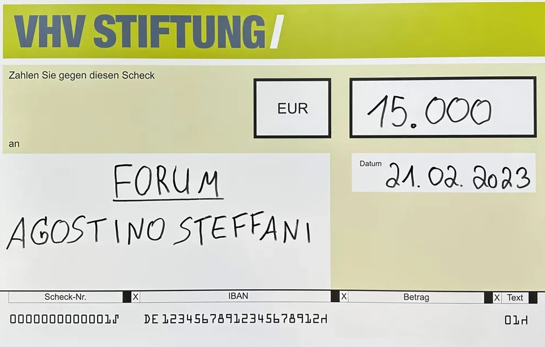 Die VHV Stiftung fördert seit vielen Jahren Projekte im kulturellen, wissenschaftlichen und sozialen Bereich. Heute fand die Scheckübergabe für das neueste Förderprojekt statt: Dietrich Werner, Vorstandsvorsitzender der Stiftung, übergab den symbolischen Scheck über 15.000 Euro an den künstlerischen Leiter des Forums Agostino Steffani, Prof. Bernward Lohr – zur Förderung der 6. Steffani-Festwoche vom 19.02. bis 26.02.2023.
