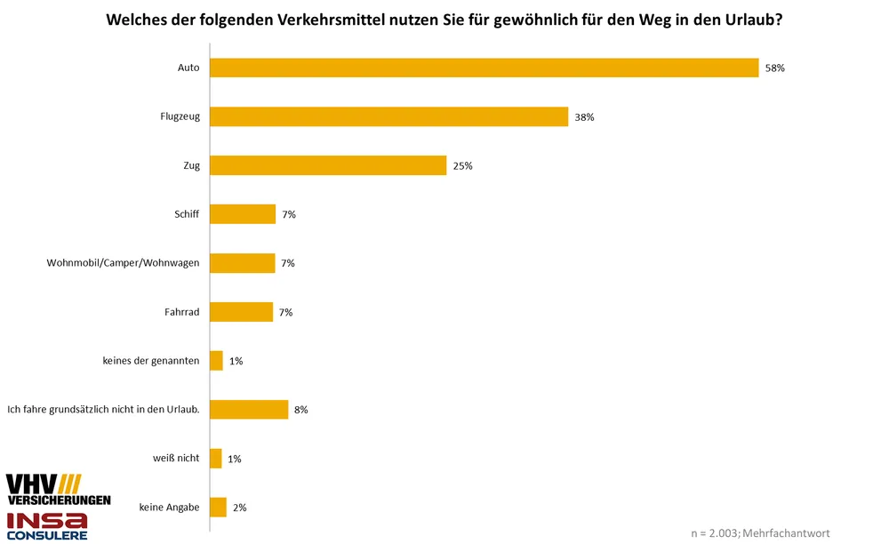 Pünktlich zum Start der Urlaubszeit hat die VHV mit dem Marktforschungsinstitut INSA-CONSULERE, Erfurt, eine repräsentative Umfrage zur Sicherheit des Hab und Gut auf Reisen und der Gegenstände zuhause beauftragt. Eingangs wurde die Frage gestellt, welches Verkehrsmittel für gewöhnlich für den Weg in den Urlaub genutzt wird. Bei der Wahl zwischen Auto, Flugzeug, Zug, Schiff, Wohnmobil/Camper/Wohnwagen und Fahrrad, gaben über die Hälfte der befragten Personen an, das Auto für den Weg in den Urlaub (58 Prozent) zu nutzen. Dahinter folgen das Flugzeug mit 38 Prozent und der Zug mit 25 Prozent der Nennungen.