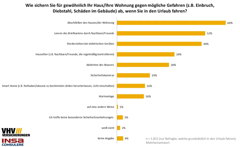 Wenn die von uns befragten Personen in den Urlaub fahren, sichern 64 Prozent ihre Wohnung bzw. ihr Haus durch Abschließen ab. Dahinter folgen mit 52 Prozent das Leeren des Briefkastens durch Nachbarn oder Freunde und 49 Prozent ziehen bei elektrischen Geräten den Stecker. Jeweils etwa ein Drittel engagiert einen Haussitter (34 Prozent) und/oder dreht das Wasser ab (30 Prozent). 19 Prozent nutzen Sicherheitskameras und jeweils 16 Prozent Smart Home Systeme und/oder eine Alarmanlage.