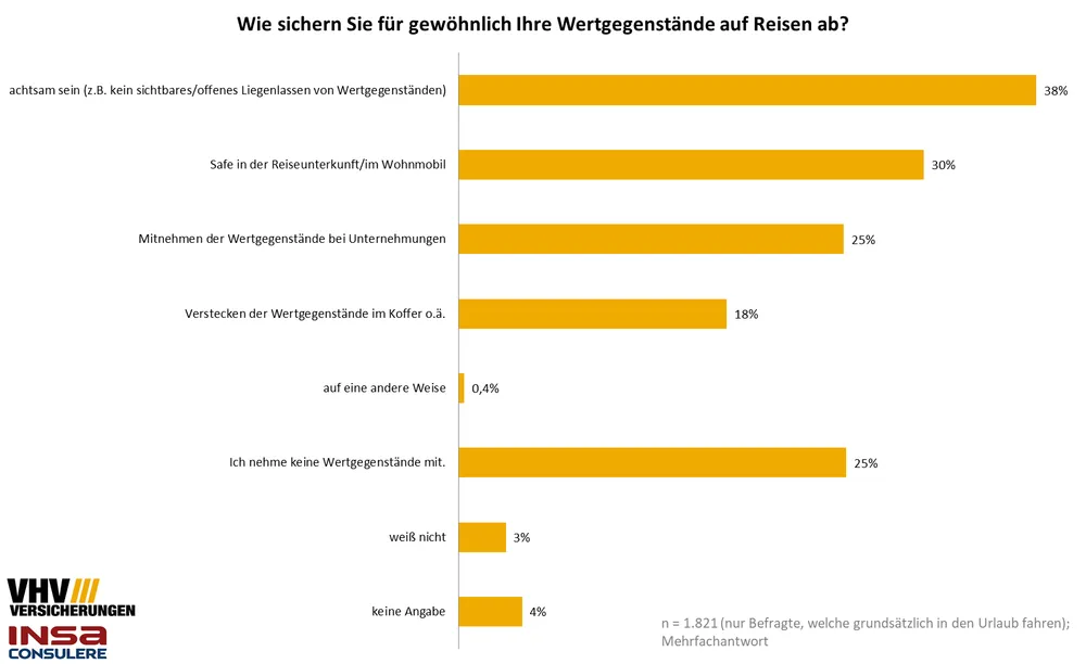 Im Urlaub angekommen oder auch während der Urlaubsreise sichern sich die Umfrageteilnehmer am häufigsten durch Vorsicht ab: 38 Prozent derer, welche grundsätzlich in den Urlaub fahren, geben dies an. Dahinter folgt der Safe in der Reiseunterkunft bzw. im Wohnmobil mit 30 Prozent und 25 Prozent nehmen ihre Wertgegenstände bei Unternehmungen mit. 18 Prozent verstecken ihre Wertgegenstände im Koffer oder Ähnlichem. Ein Viertel (25 Prozent) der Urlaubsreisenden nehmen erst gar keine Wertgegenstände in den Urlaub mit.
