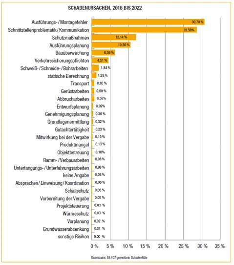 Die beiden häufigsten Schadenursachen am Bau sind mangelhafte Ausführung und mangelnde Kommunikation(siehe Grafik 1 im Anhang). Hier handelt es sich um klassische, immer wiederkehrende Ursachen, die bereits im VHV-Bauschadenbericht 2021/22 zum Thema „Qualität und Kommunikation“ thematisiert wurden. Den Link zu diesem Bericht finden Sie weiter unten.