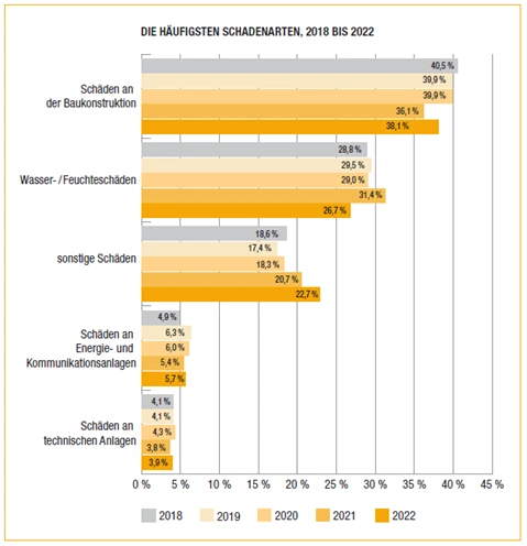 Schadenarten: Schäden an Baukonstruktion und Wasserschäden dominieren